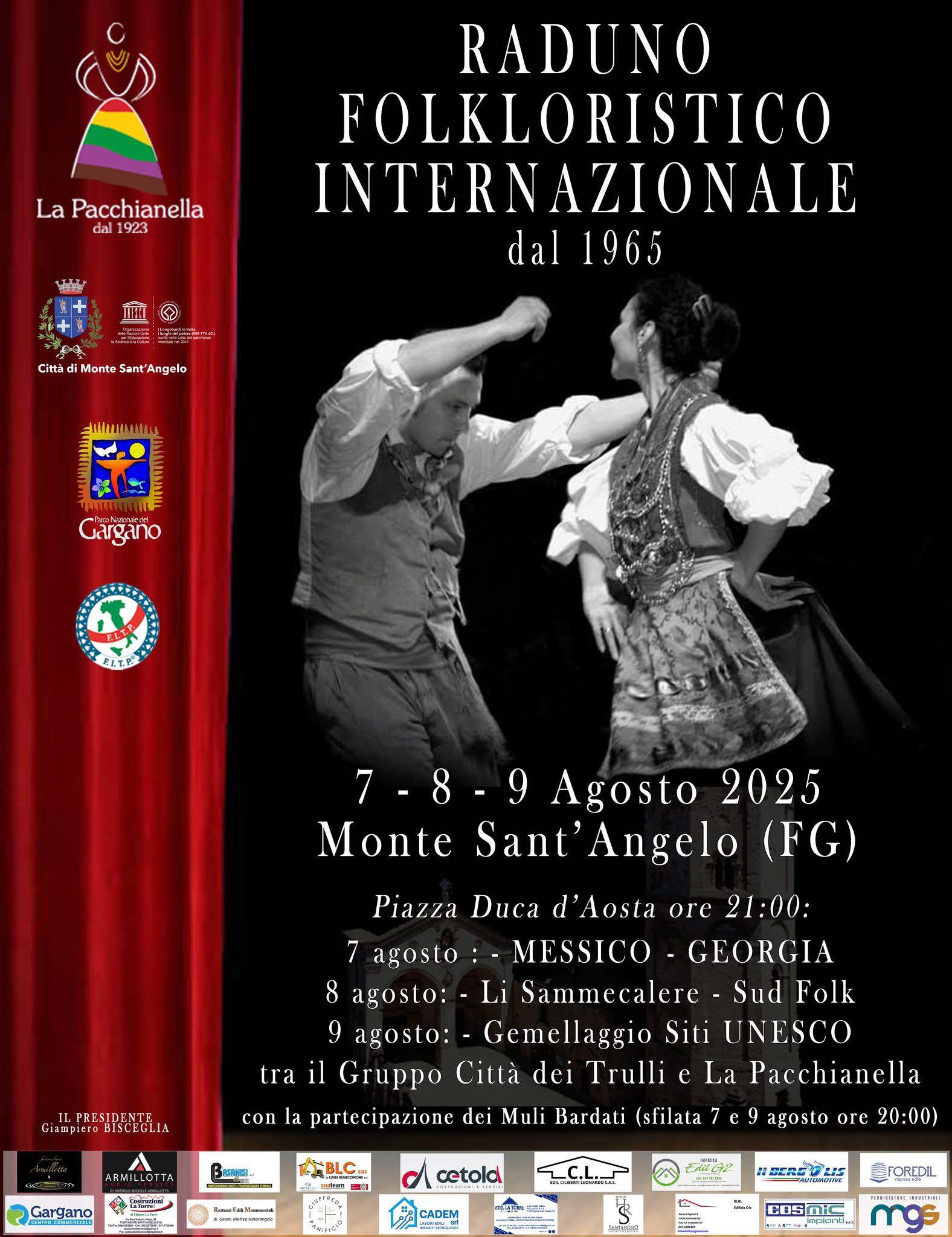 Un ritorno atteso e carico di storia: dal 7 al 9 agosto 2025 Monte Sant’Angelo ospiterà, dopo 15 anni di assenza, il Raduno Folkloristico Internazionale “Città di Monte Sant’Angelo”, nella storica Piazza Duca d’Aosta, luogo simbolico che ha visto nascere, nel 1965, questo grande evento di cultura, tradizione e fratellanza tra i popoli. Ideato e fortemente voluto dal Gruppo Folk “La Pacchianella” – autentica istituzione cittadina nata nel 1923 – il Raduno rappresenta una delle più importanti manifestazioni identitarie della città, capace di promuovere il patrimonio culturale del Gargano e di costruire legami internazionali attraverso la danza, la musica e i costumi della tradizione popolare.